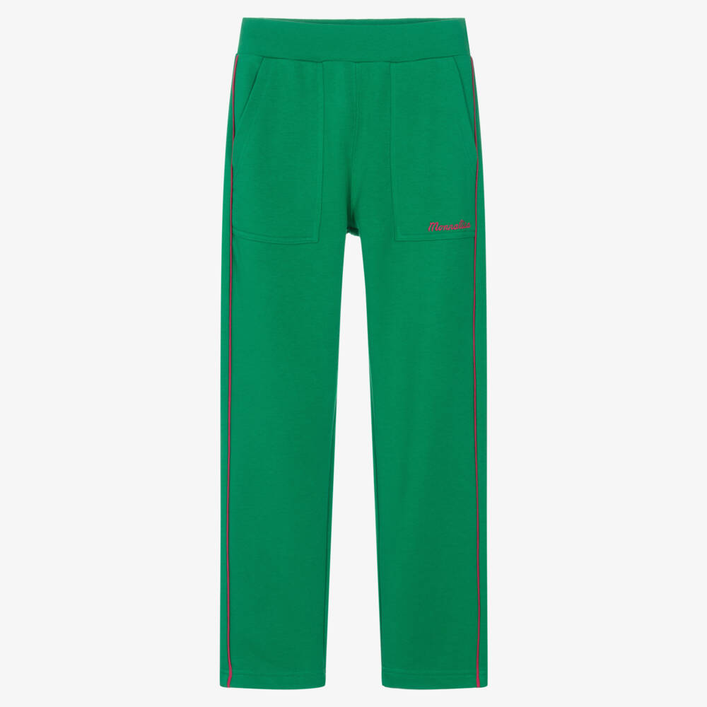 Teen girls can add some vibrancy to their casual wardrobe with these green joggers by Italian designer Monnalisa. Super comfortable in soft, medium-weight jersey, these straight-leg joggers are trimmed with contrast pink piping on the sides of the legs. With a softly elasticated waist, they have front patch pockets, one of which is signed with pink logo embroidery for colour coordination.