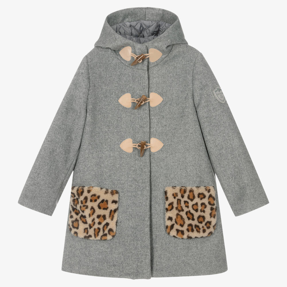 Hooded grey marl duffle coat for teen girls by Italian designer Monnalisa, with fun, faux fur, leopard print patch pockets. It has a faux suede, grey logo crest on one sleeve, with beige, faux leather and horn toggles, below which are popper fastenings. Cosy and warm with a fixed hood, the coat is made in a soft wool blend and has a silky quilted lining.