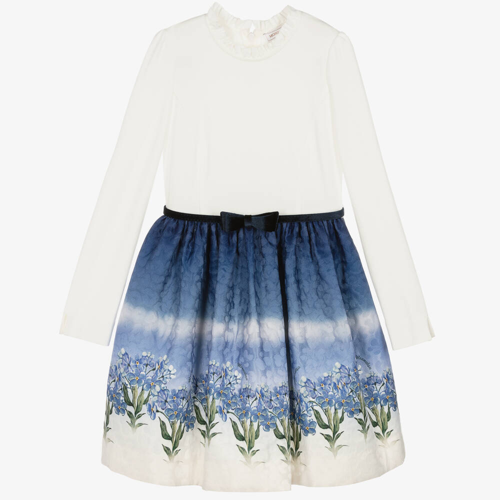 Ivory and blue dress for teen girls by Italian brand Monnalisa, great for smarter occasions. The beautifully soft, viscose-blend, jersey bodice is slightly fitted, with a ruffled, stand-up collar and pretty puffed sleeves. The blue, cotton-blend, animal-print jacquard skirt has a floral pattern around the hemline, with subtle logos. It has a soft twill lining for comfort, with tulle frills to give extra volume. The dress fastens with a neat, concealed zip around the back and comes with a navy blue velvet belt that has a central bow.