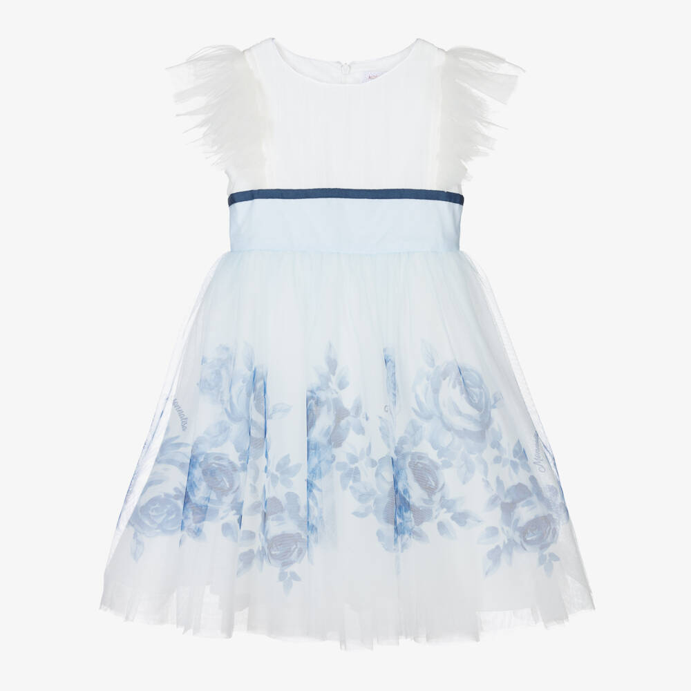 A beautiful ivory tulle dress for teen girls by Monnalisa. Lovely for special occasions, this fit-and-flare design has a fitted bodice with flutter sleeves and constrast blue bands across the waist. The full skirt has a tulle overlay with a gorgeous painted-effect blue floral print. There are several underlayers of tulle for volume and a cotton lining for comfort.