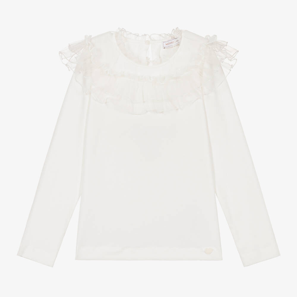 From Italian brand Monnalisa, a cotton ivory top for teen girls. Worn alone or underneath a sweater, this long-sleeved style has a discreet logo charm on the hem and a statement tulle collar which draws the eye. Made from soft and stretchy cotton jersey, it has a keyhole button fastening on the back for a neat finish.