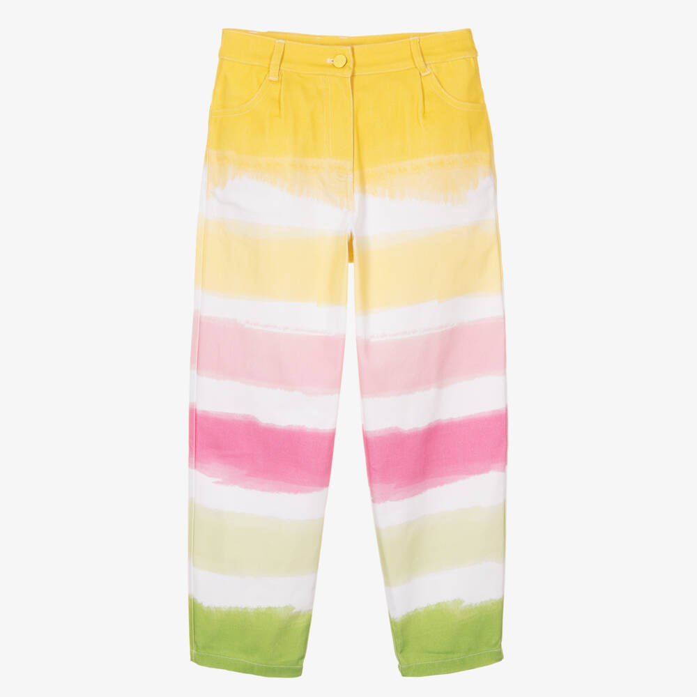 Unique denim jeans for teen girls by Monnalisa, designed in colourful, brushstroke stripes. Cool and casual, these loose-fitting jeans have front and back pockets and fasten with both a zip and embossed button. Added stretch ensures comfort and plenty of movement, while the floral print jacron on the back adds a designer touch.