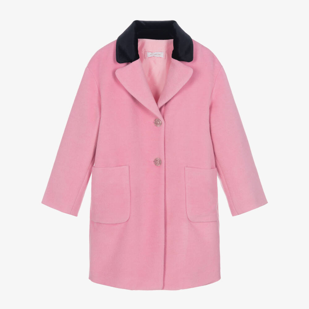 Beautiful pink coat for teen girls by Italian label Monnalisa Chic, designed with a contrasting black velvet collar. Made in a soft wool blend, this elegant, single-breasted coat fastens with rhinestone-embellished buttons on the front for a touch of sparkle. It is lined in silky smooth satin with a tonal logo for a subtle designer finish.