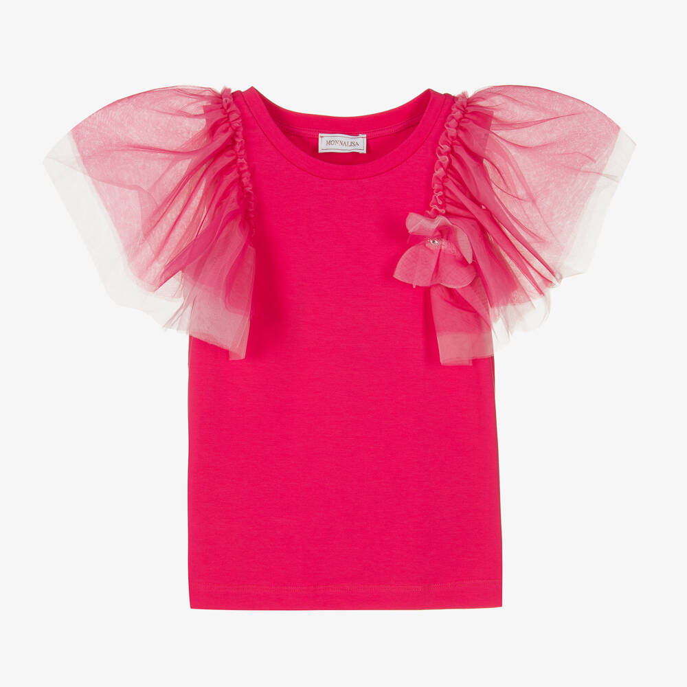 A gorgeous fuchsia pink T-shirt for teen girls by Italian brand Monnalisa. A stylish take on a classic piece, this cotton jersey T-shirt has exaggerated tulle sleeves and a matching tulle butterfly appliqué on one side. The sparkly crystal detail adds a pretty finishing touch.