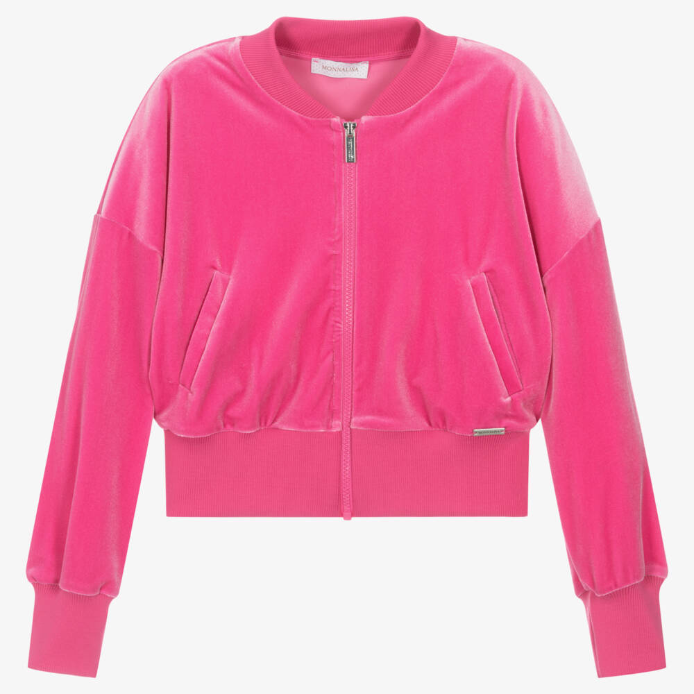 Teen girls will make a fun fashion statement in this fuchsia pink velour zip-up top by Italian brand Monnalisa Chic. Cropped in style, it has tulle ruffles across the shoulders and along the sleeves, patterned in white polka dots. It is super soft and comfortable too, with neat, ribbed trims, useful front pockets and a silver logo plate on one side.