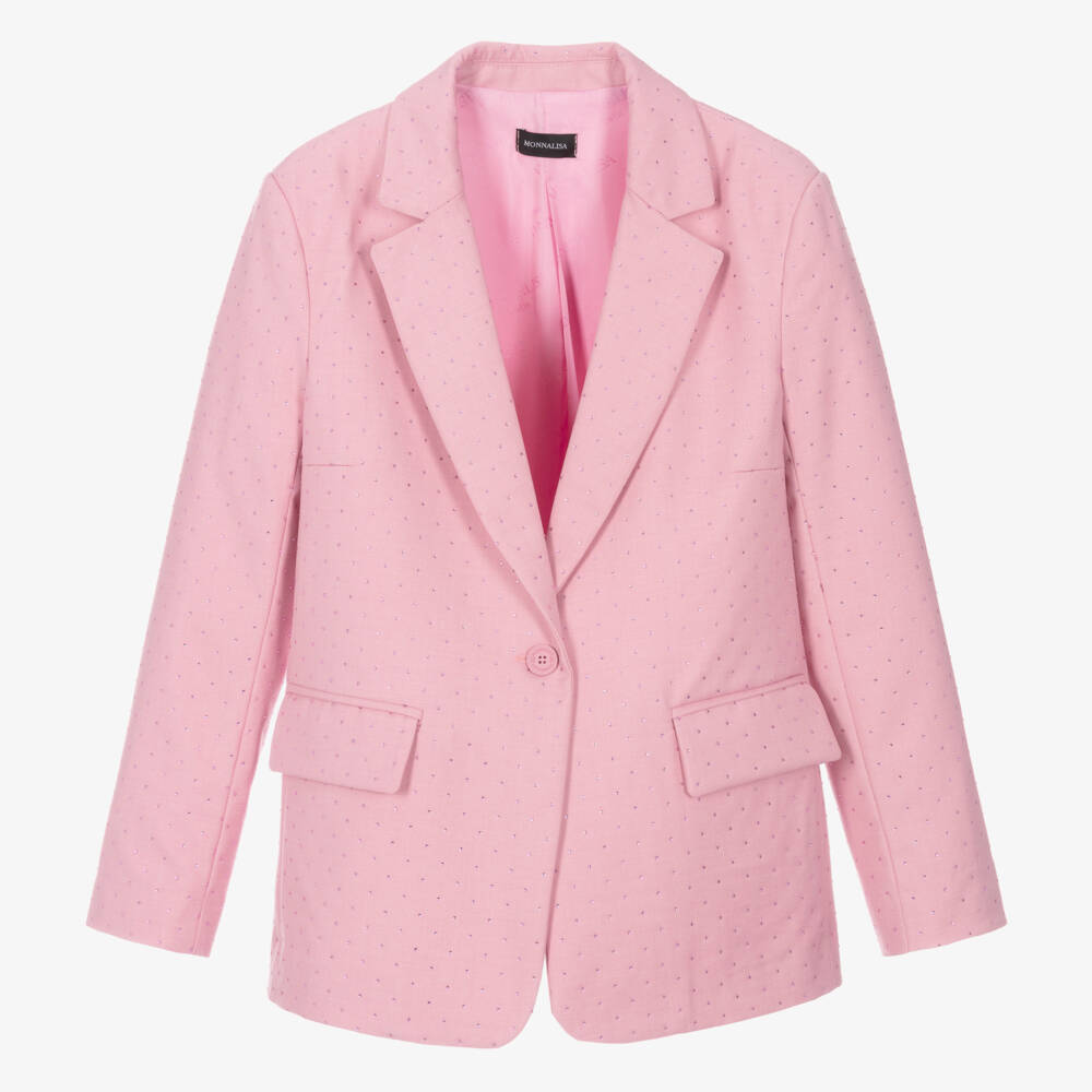 A gorgeous pink blazer for teen girls by Italian designer Monnalisa, covered in dazzling pink rhinestones for added impact. Ideal for a party or a smart occasion, this stand-out piece has padded shoulders, notch lapels and flap pockets on the front. It has a single-breasted silhouette, fastening with an embossed pink button. The soft, mid-weight fabric is lined with silky smooth, logo branded material which can be seen when the jacket is open.