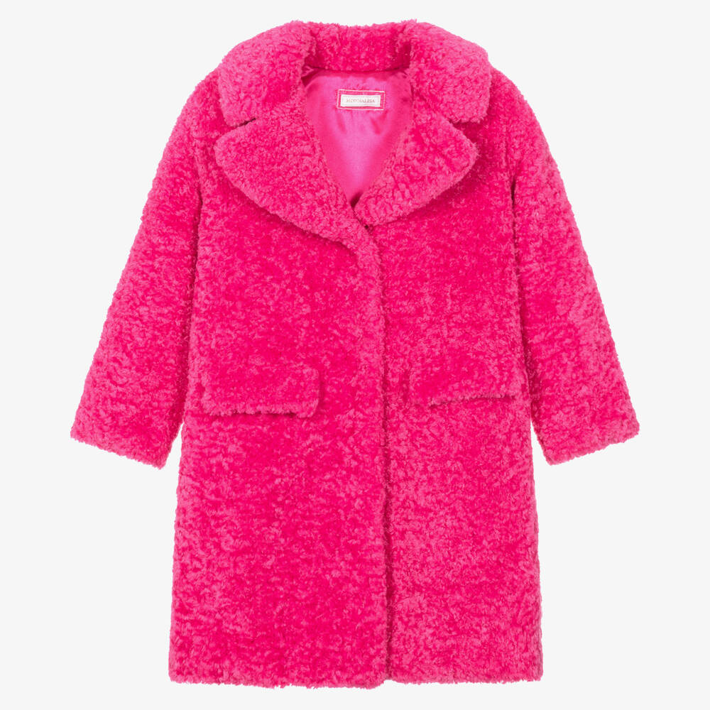 In a stylish bright pink design, this teddy fleece coat for teen girls is from Monnalisa. An eye-catching single-breasted style, it has an oversized lapel collar and flap pockets on the front. A silky satin lining and concealed popper fastenings complete the look.