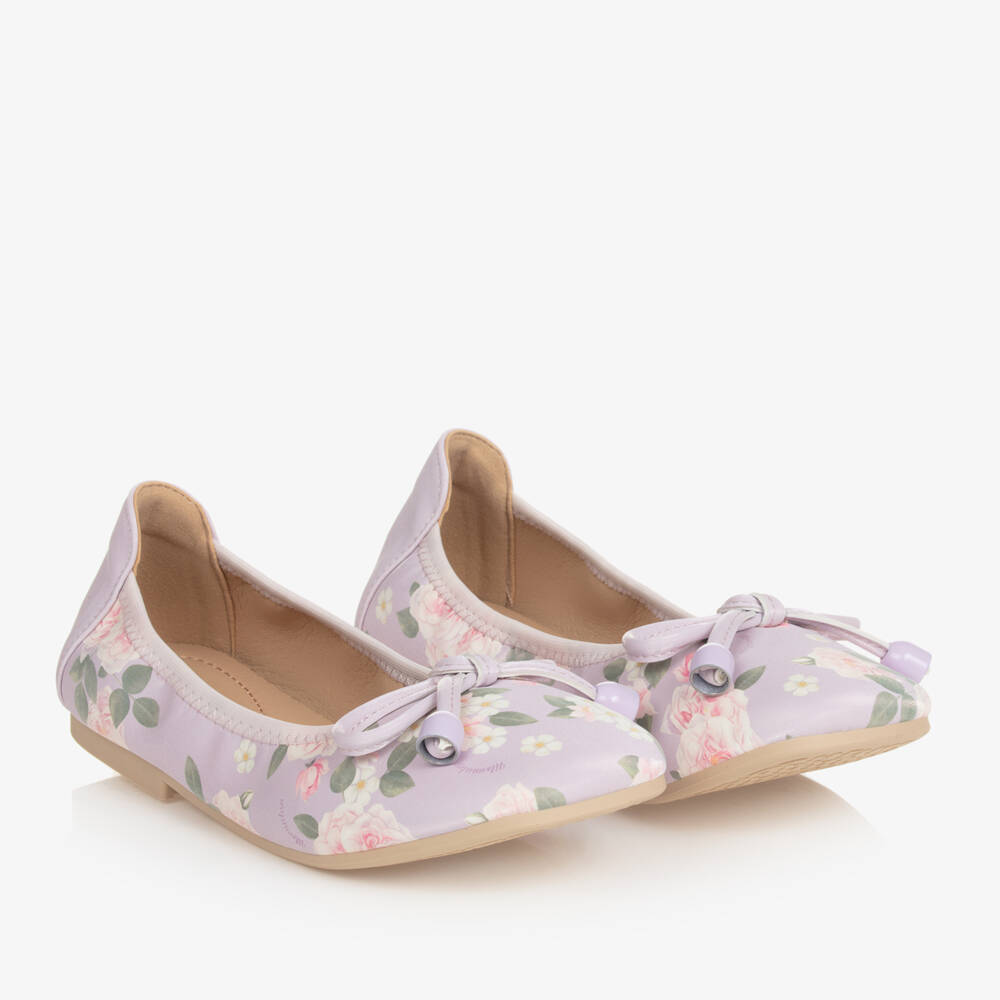 Gorgeous lilac purple ballerina flats for teen girls by Italian brand Monnalisa, patterned with beautiful pale pink florals. Combining a pretty look with comfort, they are made from glossy and smooth faux leather with a lovely bow on the front. They have a cushioned insole and a non-slip rubber outsole and are gently elasticated around the opening to allow for a good fit and easy slip-on.