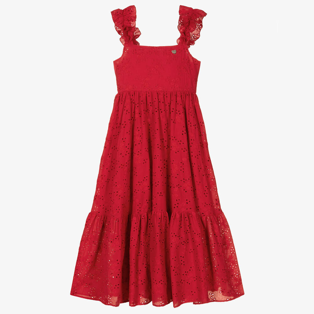 A light-hearted sleeveless dress for teen girls by Monnalisa in a bold red shade. Stitched with a silver heart-shaped logo-engraved charm, it has narrow straps with pretty frilled trims and a lovely tiered gathered skirt. Made from smooth cotton broderie anglaise with a soft lining layer, it has a shirred elasticated panel on the back for a comfortable fit.