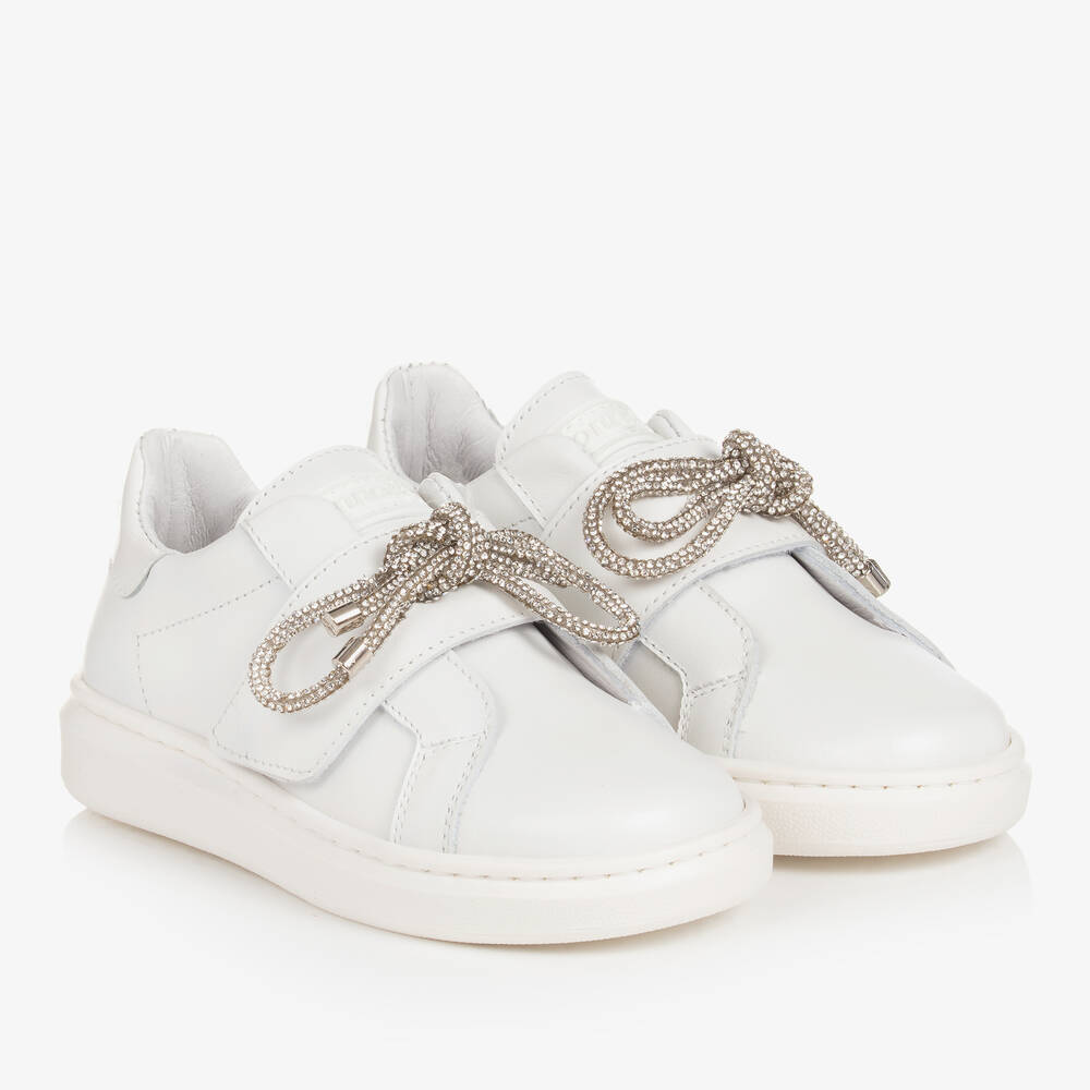 Cool white trainers for teen girls by Monnalisa. They have statement silver-tone diamanté-studded bows on the velcro straps. Lined with soft leather for comfort, they have rubberised soles for improved grip and removable insoles. There is an iridescent glitter heart detail on the heel and a tonal rubberised logo patch on the tongue for those signature designer touches.