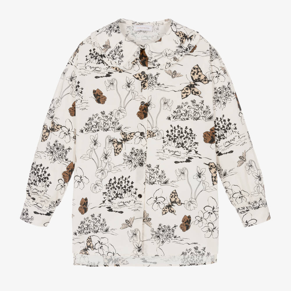 Ivory cotton blouse for teen girls by Italian brand Monnalisa, with a bold sketched print of butterflies and flowers in black and beige, and the designer's logo in one corner. Casual and oversized, it has a frilled trim on the collar and a vented hemline that is longer around the back than the front for a relaxed look. There are small, black button fastenings on the front.
