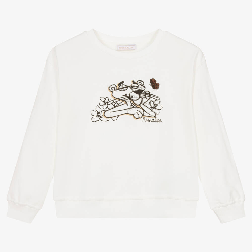 Ivory sweatshirt for teen girls by Italian designer Monnalisa. Inspired by American film, this casual top has a black and beige Pink Panther hand-sketched motif on the front. This is outlined with black embroidery and paired with a sparkly diamanté logo. It is made in soft cotton jersey with a ribbed neckline and a cosy, fleecy inside.