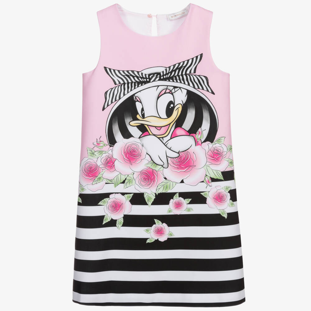 Teen girls pink, white and black striped shift dress by Monnalisa, with a Disney© Daisy Duck print. It is made in luxurious crêpe, with a cotton lining and back button fastening.