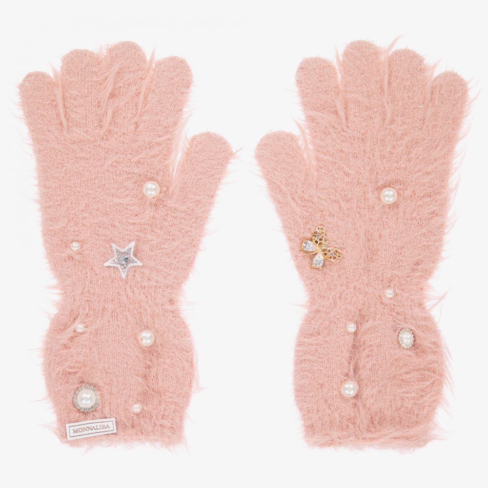Luxury pink long-length gloves for teen girls, by Monnalisa. Made from a soft, fluffy knit, they are decorated with pearls, sparkly diamanté jewels and cover the wrists.