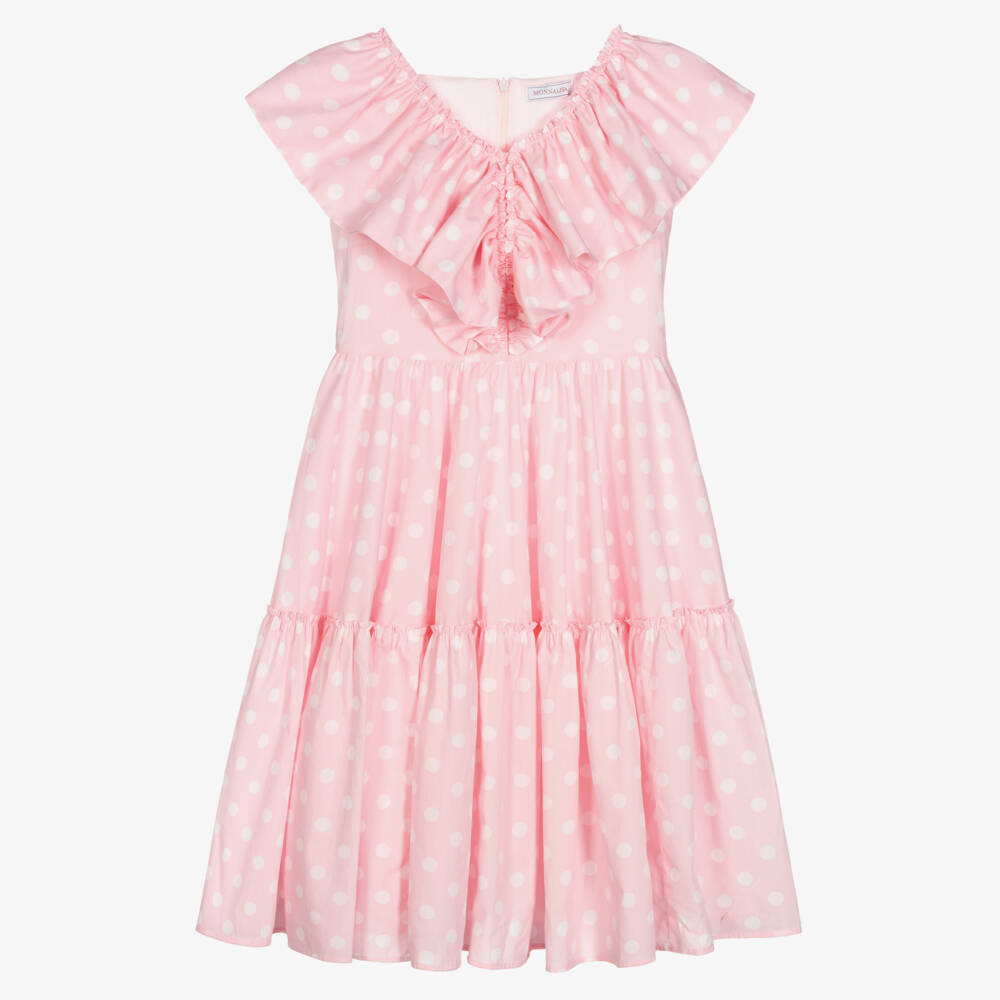 Gorgeous pink polka dot dress for teen girls by Italian designer Monnalisa. Made in cotton poplin, it has beautiful ruffles on the front and back of the bodice, with a tiered skirt for a full and flared shape. Fully lined in cotton voile for comfort, it fastens on the back with a concealed zip.
