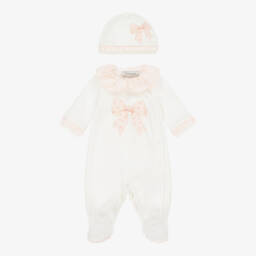 White cotton jersey babysuit set for boys by Monnalisa, with an adorable seal and bubble pattern in blue, grey and yellow. The popper-fastening babygrow has striped seersucker trim for a nautical feel, and the hat has a turned up brim. Both pieces are finished with signature logo embroidery.