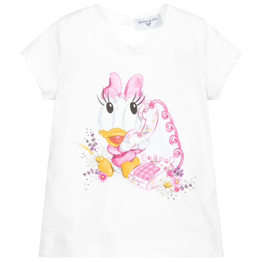 White cotton jersey T-shirt by Monnalisa Bebé, with a Disney© Baby Daisy Duck print. Cute for little girls, there are sparkly diamanté stud decorations and a single button fastening on the back.