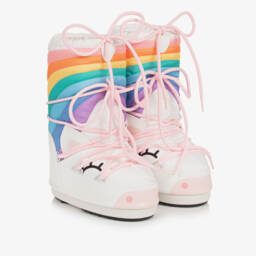 Pink water-repellent snow boots for baby girls by Moon Boot. In the brand's original iconic style, they are padded and lined with soft faux shearling for extra cosiness. They have an elasticated logo band around the ankle to support the shoe and elasticated front laces to easily slip them onto little feet. The durable outer sole is designed with tiny suction pads for improved grip.