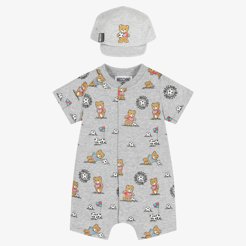 Fun grey shortie and hat set for baby boys by Italian designer Moschino Baby, made in the softest cotton jersey. It has the brand's signature football Moschino Teddy Bear logo printed all-over, with useful popper fastenings on the front. To complete this eye-catching look, the cap has a tag logo on the front and an adjustable velcro strap on the back.