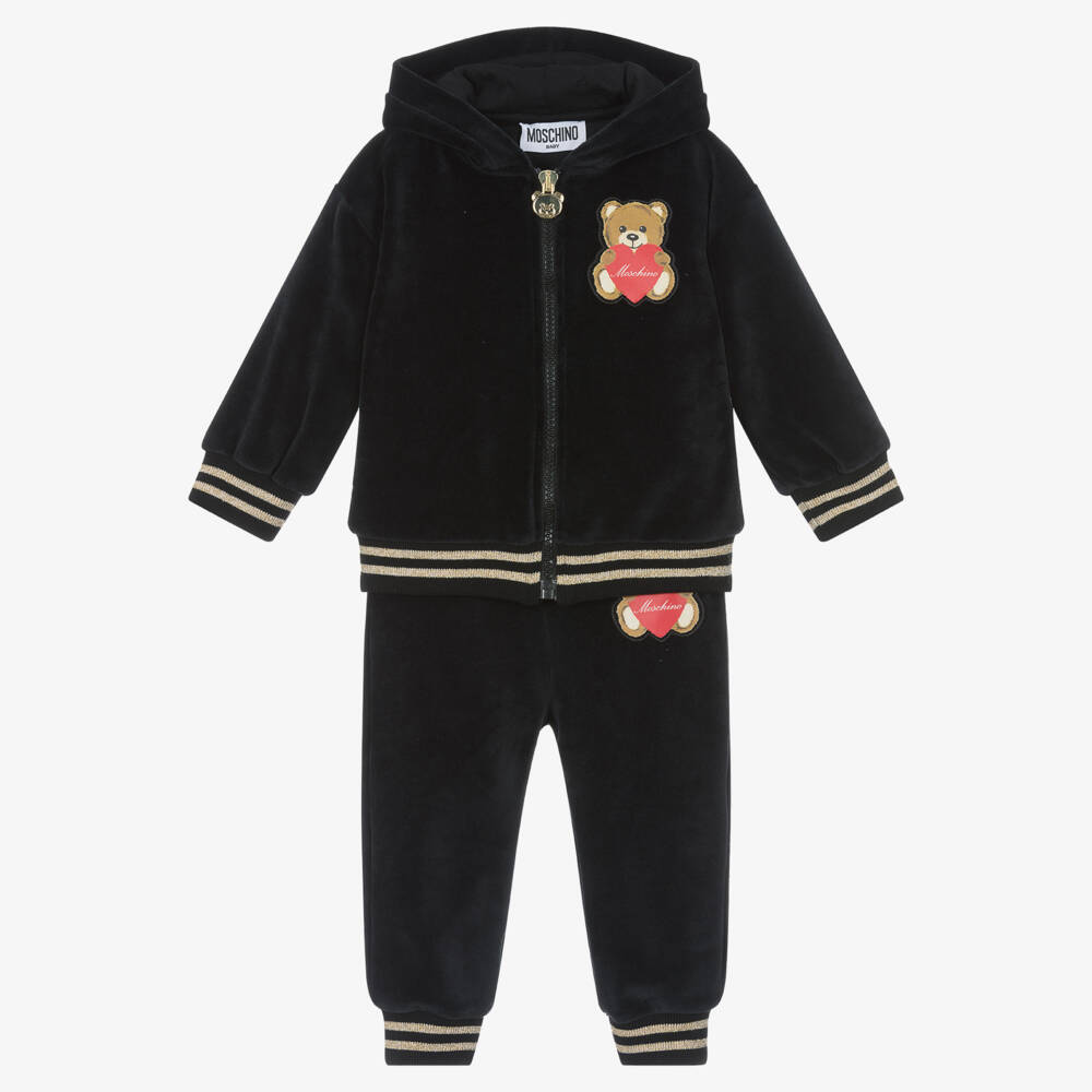 Soft and comfortable, this black cotton tracksuit for baby girls by Moschino Baby is made from cosy velour. The hooded top has an adorable Moschino Teddy Bear appliqué on the chest, handy side seam pockets and a gold logo charm on the front zip fastening. The joggers have a matching appliqué on the hip and an elasticated waist for additional comfort. Both pieces have metallic gold stripes on the ribbed trims for added sparkle.