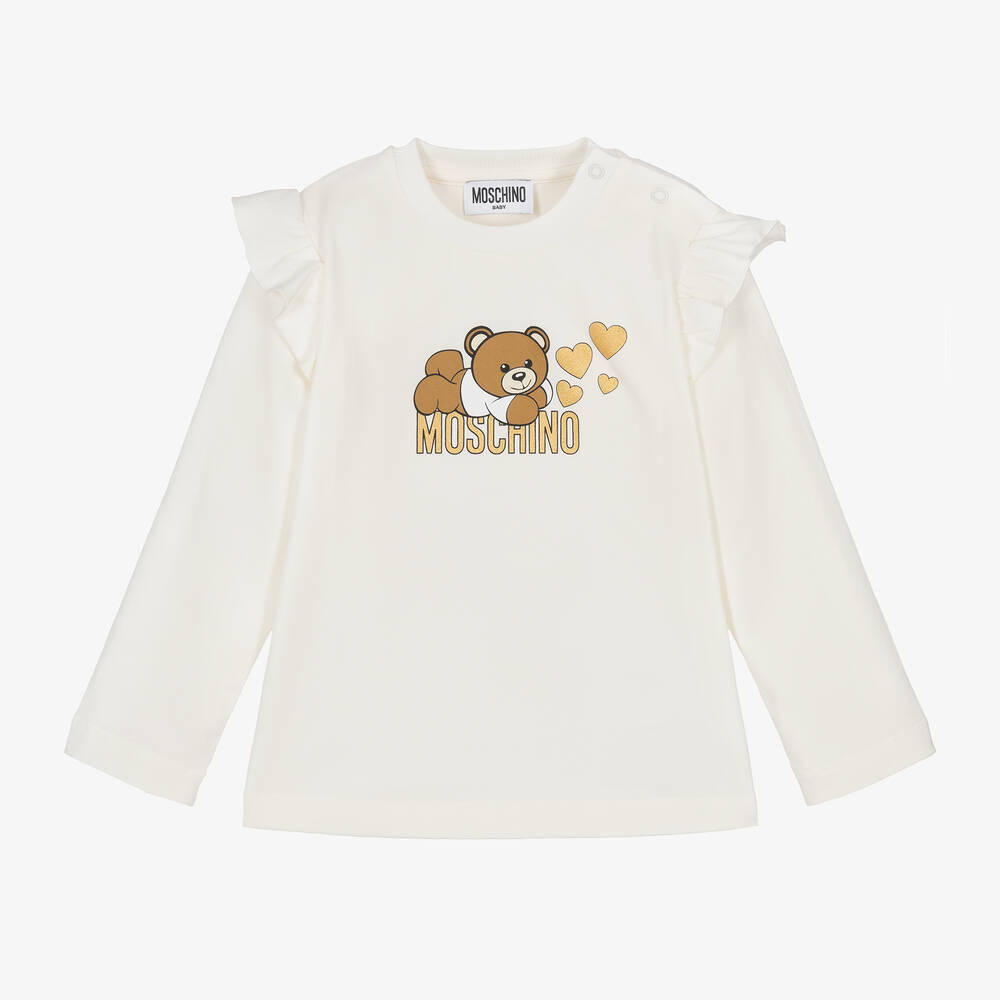 An ivory long-sleeved top for baby girls by Moschino Baby, made in soft cotton jersey. The designer's iconic Moschino Teddy Bear is printed on the front, with a metallic gold logo and hearts for a sweet branded look. There are pretty ruffles over the shoulder with easy-fastening poppers on one shoulder to help with dressing.