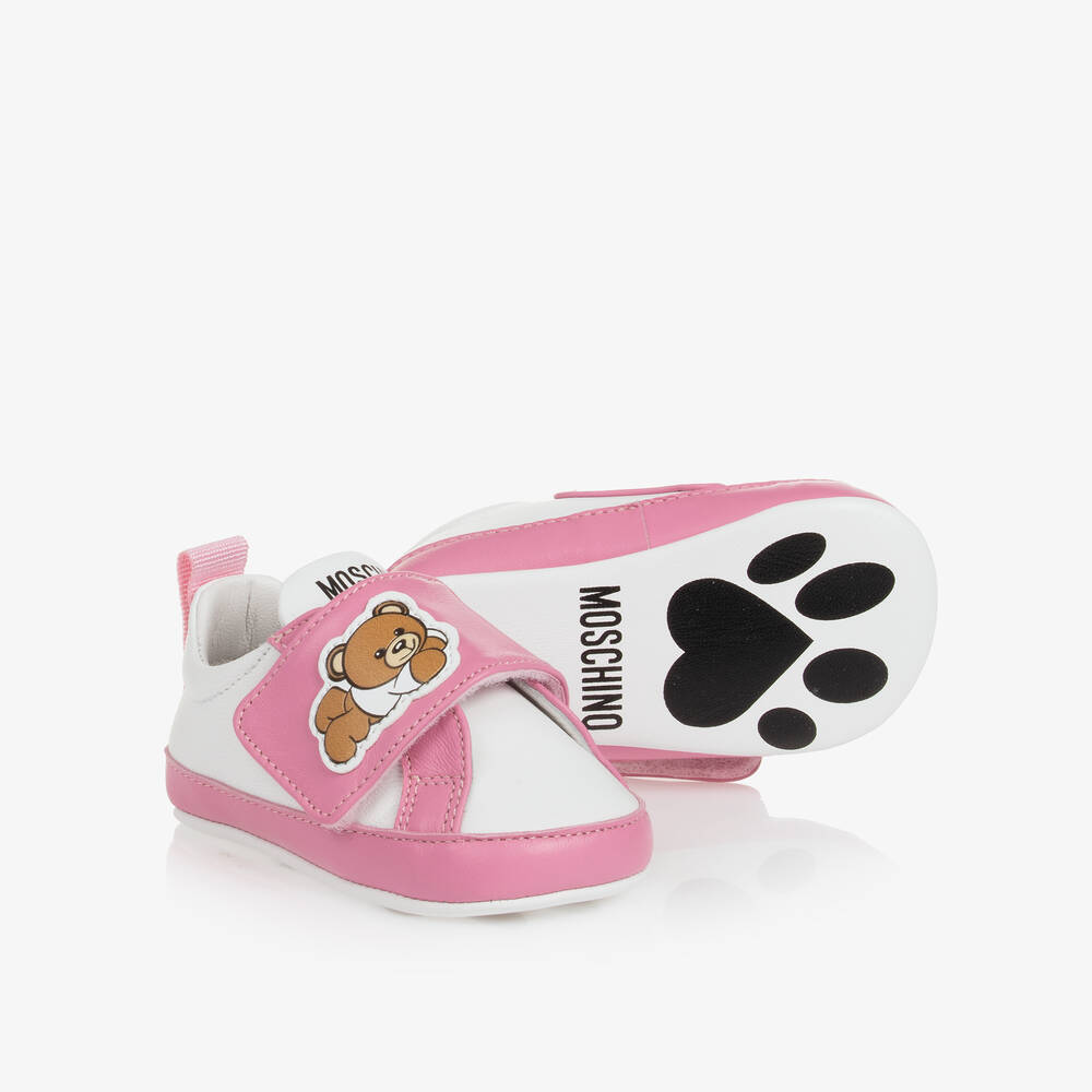 Pink and white pre-walker trainers for baby girls from Moschino Baby. Soft and supple for little feet, these cute, two-tone shoes have a Moschino Teddy Bear on the velcro strap and logo lettering on the tongue. They are fully lined with leather and are equipped with a pull loop on the heel for quick and easy dressing. There is a black paw print on the smooth leather sole with further Moschino branding.