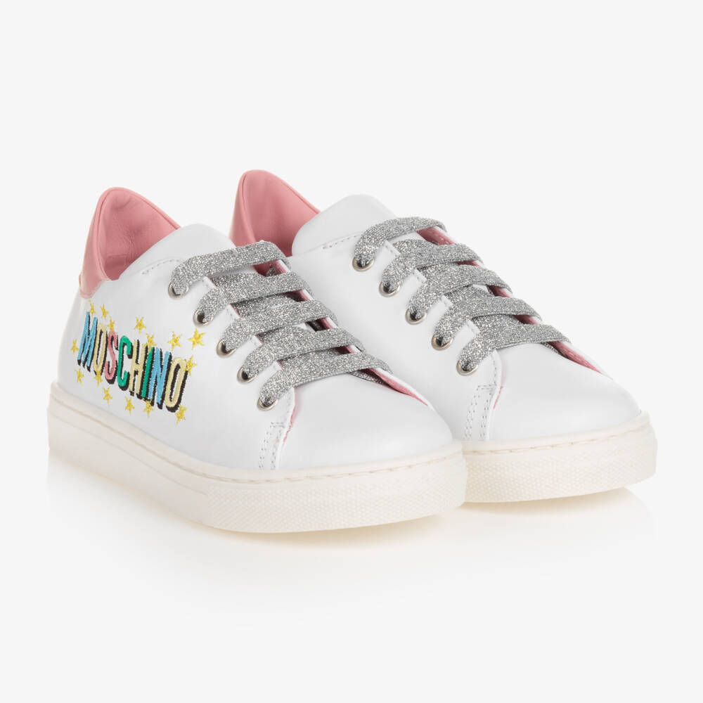 White leather trainers for baby girls by Moschino Baby, with cute pink trims and sparkly silver laces. In a classic silhouette, they have a multicoloured logo embroidered on one side, bordered with small yellow stars. Combining comfort and style, they have a gently padded leather insole and a non-slip rubber outsole.