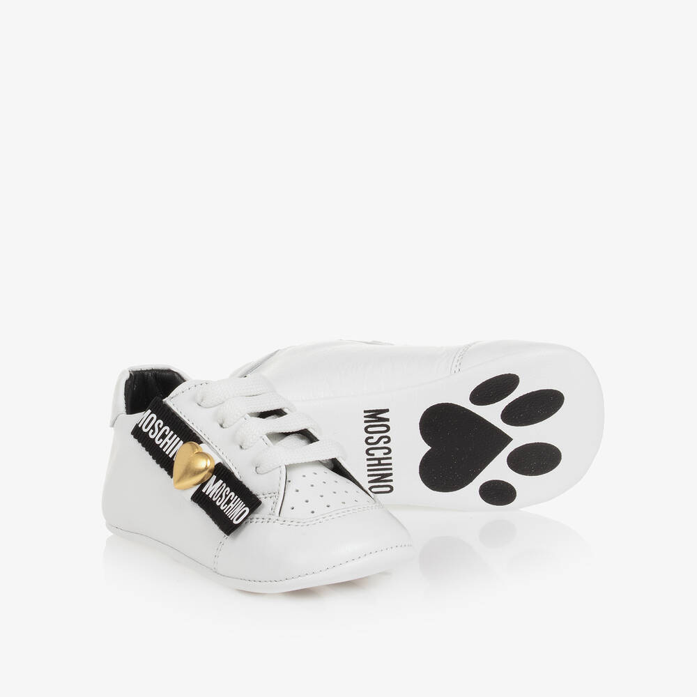 White lace-up pre-walker trainers for baby girls by luxury label Moschino. Decorated with a black branded grosgrain ribbon bow and shiny gold heart embellishment on the sides, they are printed with bold logo motifs on the tongues for a distinct finish. Made from smooth leather with a soft leather lining, they have perforated detailing on the toes and a flexible leather outsole with a cute paw print motif for a sweet finish.