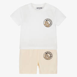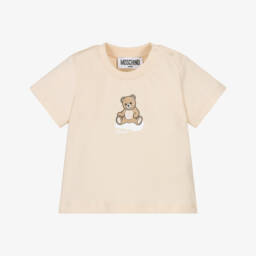 Beige T-shirt for baby boys and girls by Moschino, made in soft and comfortable cotton jersey. For instant brand recognition, it is printed with the luxury label's Moschino Teddy Bear and logo on the front. It has a ribbed crew neckline and branded poppers on the shoulder to help with dressing.