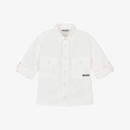 Black and white gingham check shirt for boys and girls by Moschino, made in soft poplin with a slight stretch for comfort. For designer appeal, the iconic Moschino Teddy Bear logo is appliquéd on one of the chest pockets. The long sleeves can be rolled up and secured with button tabs, for a more casual look.