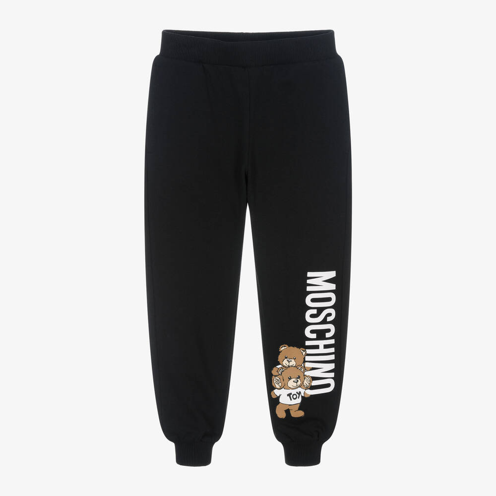 Black joggers for boys and girls by Moschino Kid-Teen, made in mid-weight cotton jersey with a fleecy inside. For a branded look, they are printed with a bold white logo and two Moschino Teddy Bears on one leg. Casual and comfortable, they have an elasticated waist and ribbed ankle cuffs, with useful side seam pockets.