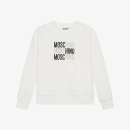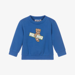 Black cotton sweatshirt for boys and girls. Unmistakably by luxury Italian brand Moschino, it has the signature playful Teddy Bear motif and bold black logo printed on the front. Ideal for cooler days, it is made in soft jersey with a cosy, fleecy interior and neat ribbed trims to keep the cold out.