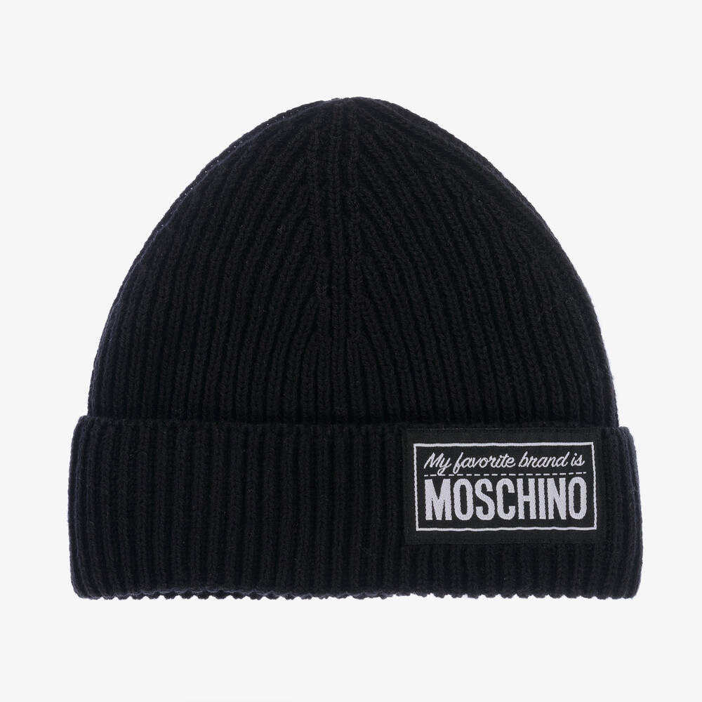 A black beanie hat for boys and girls by Moschino Kid-Teen. Ideal for the cooler weather, it is made from a cosy ribbed cotton and wool knit. Stitched on the turned-up brim is a black and white logo patch for a distinctive branded finish.