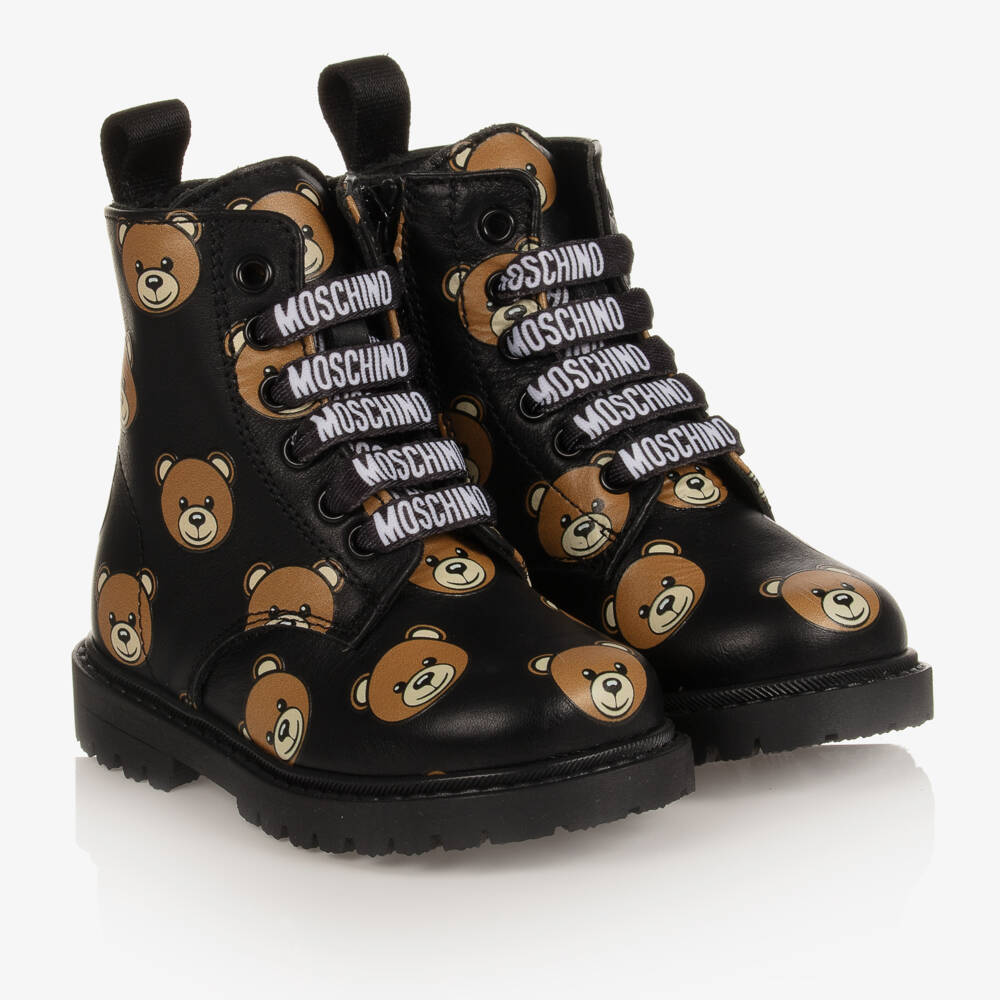 Sweet black leather boots for boys and girls by Moschino Kid-Teen, patterned all-over with Teddy Bear logos. Fastening securely with branded laces and a side zip, they have a lopped heel tab to help get them on easily. The lining is made in soft leather for lasting wear and rubber outer sole ensures firm grip.