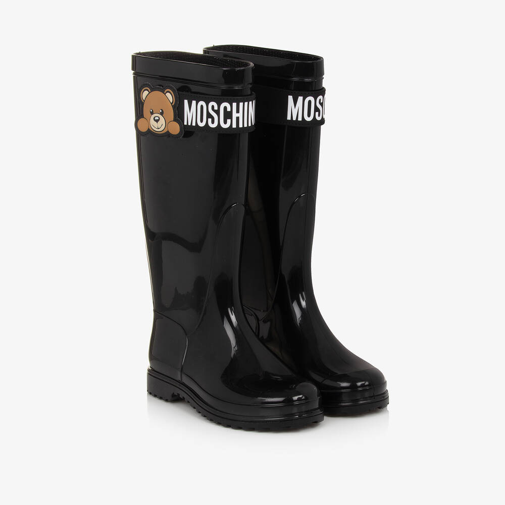 Glossy black long rain boots for boys and girls by luxury Italian designer Moschino, made from flexible rubber. Ideal for wet and rainy days, this practical style has a velcro strap around the top featuring a bold white logo print and the iconic Moschino Teddy Bear for a distinctive look. They have a soft textile lining and a non-slip rubber outer sole for improved grip on slippery surfaces.