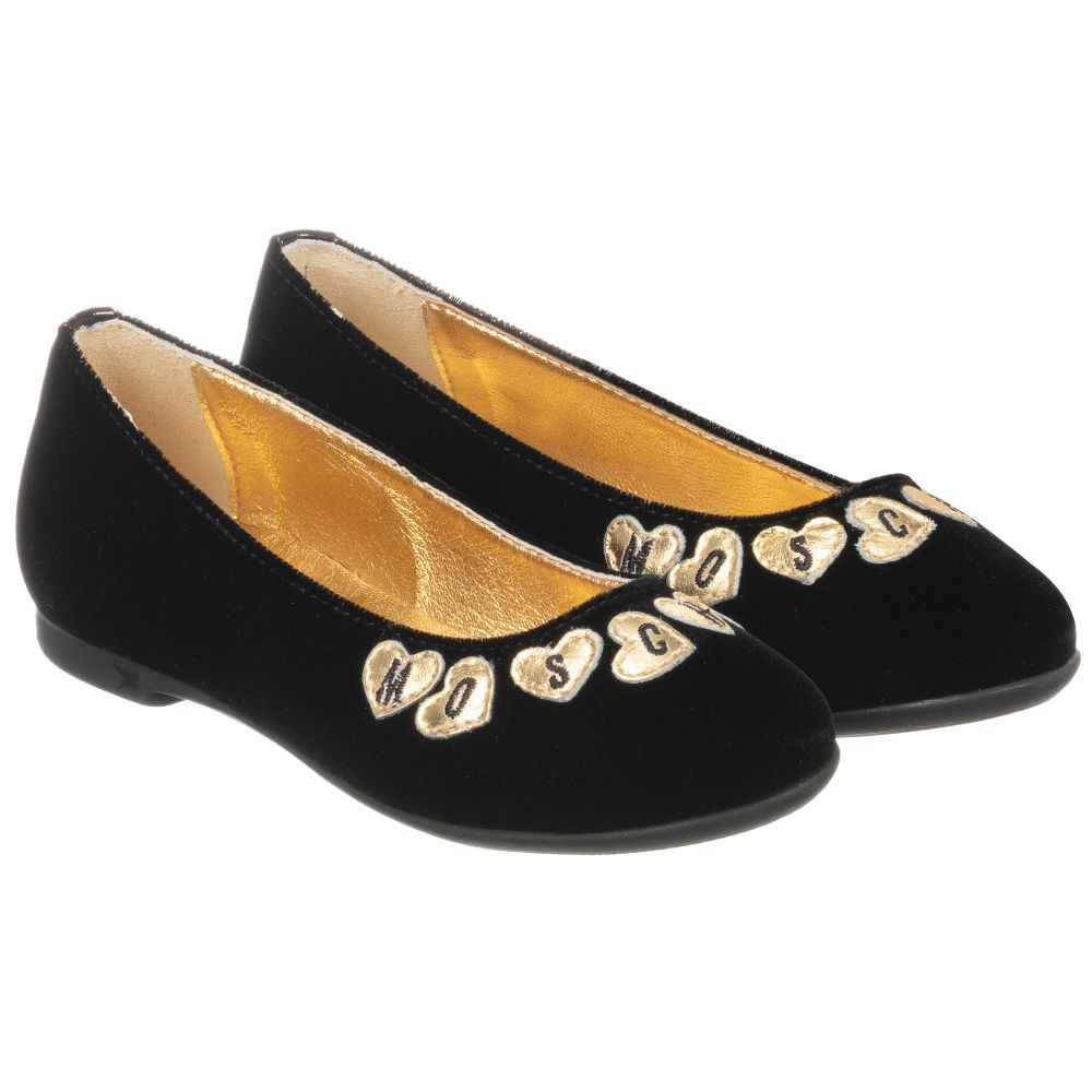 Girls smart black ballerina flats by Moschino Kid-Teen. Made in soft velvet, they have gold leather heart appliqués with embroidered letters. They have comfortable soft leather lining with lightly cushioned insole and a non-slip rubber sole.