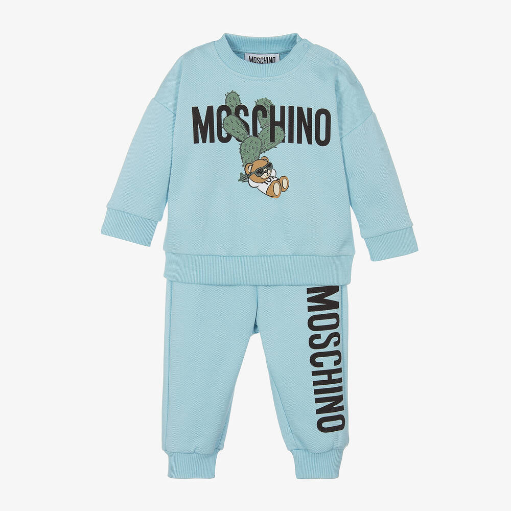 Pale blue cotton tracksuit for little boys and girls by luxury Italian brand Moschino Baby. It is made in soft, comfortable piqué, with neat, ribbed trims and a bold black logo printed on both the sweatshirt and joggers. The long-sleeved top has a cool Moschino Teddy Bear printed on the front, leaning on a green cactus. There are useful popper fastenings on one shoulder to help with dressing. Easy to wear, the joggers have an elasticated waistband and simply pull up.