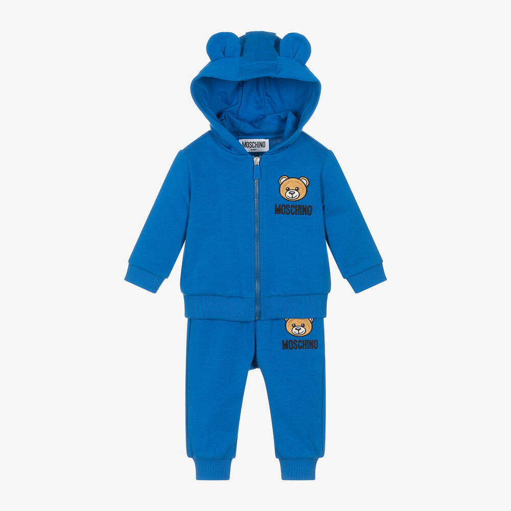 Cobalt blue tracksuit for little boys and girls by Moschino Baby, made in soft, mid-weight cotton jersey. The hooded top has side seam pockets, a zip fastening with a branded pull and cute 3D teddy bear ears on the hood. The joggers have a comfortable elasticated waistband. Both pieces have cosy ribbed trims and embroidered Moschino Teddy Bear logos in beige and black for a distinctive designer finish.