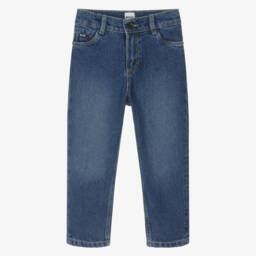 Mid-wash blue jeans for little boys and girls by luxury Italian brand Moschino Baby. In a five-pocket style, they are made in soft, stretchy denim for comfortable wear. They have a gently elasticated waist and fasten with a branded gold-tone popper on the front. For instant designer recognition, the iconic Moschino Teddy Bear badge is on the front, with a branded tab on the coin pocket.