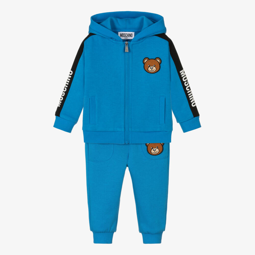 Adorable blue tracksuit for little boys and girls by Moschino Baby, made in mid-weight cotton blend jersey. Both pieces have useful front pockets and bouclé Moschino Teddy Bear appliqués on the front. The hooded zip-up top has black sleeve trims with white rubberised logo prints, whilst the bottoms have a black logo print on the back.