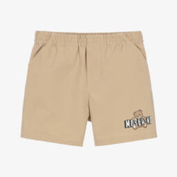 Beige cotton shorts for little boys by Moschino, featuring the brand's instantly recognisable Teddy Bear logo for a playful designer look. Casual and comfortable, they are made in lightweight twill with useful pockets and a gently elasticated waistband.
