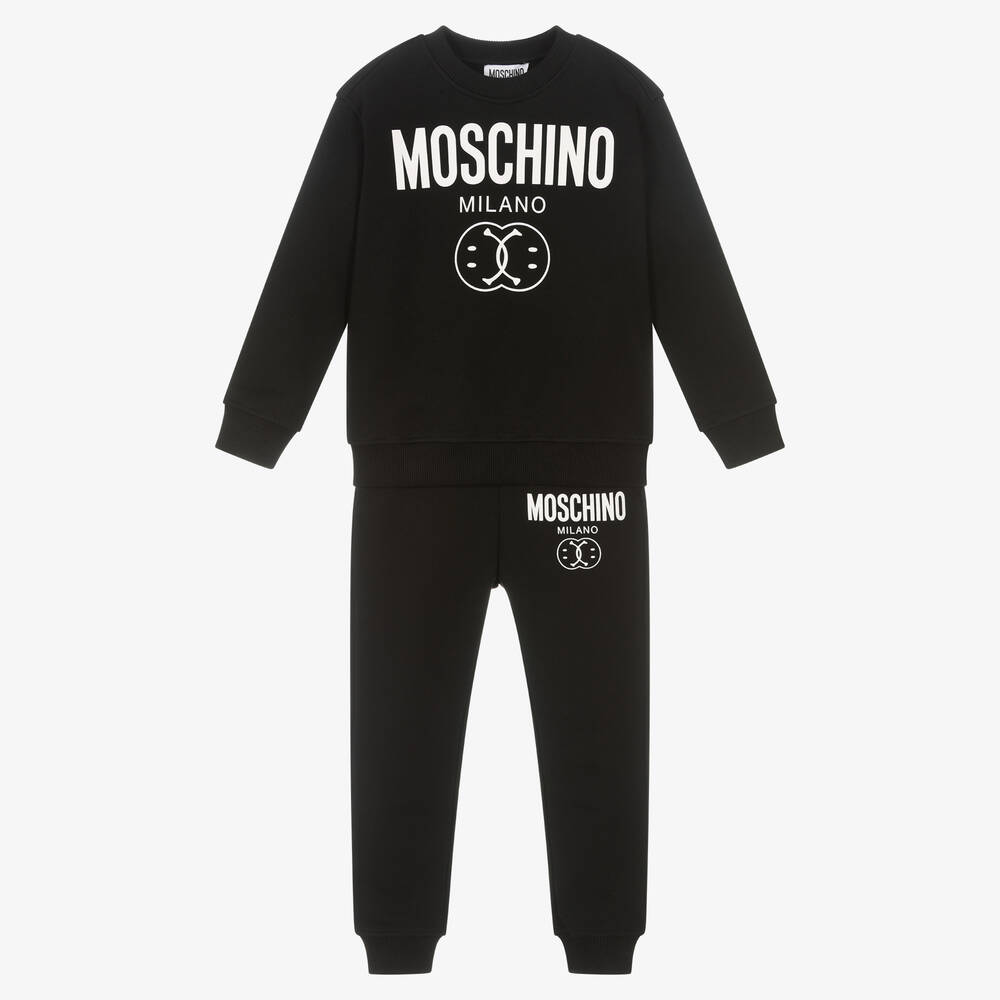 Black Mini-me tracksuit for boys by luxury Italian brand Moschino Kid-Teen, made from soft cotton sweatshirt jersey. Both items feature the iconic Double Smiley logo print in white for a cool, on-trend vibe. The crew neck sweatshirt has ribbed trims and long sleeves, whilst the joggers have front pockets and a useful internal drawstring waist.