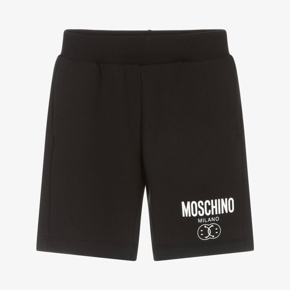 Black Mini-me shorts for boys by luxury Italian brand Moschino Kid-Teen, with a white Double Smiley logo print on one leg. They have useful side seam pockets and an internal drawstring tie on the ribbed waistband. Comfortable and easy to wear, these Bermuda length shorts are made in soft mid-weight cotton jersey.