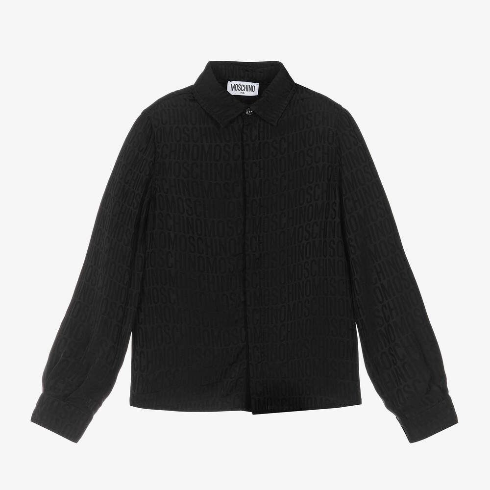 Inspired by the adult collection, this silky black shirt for boys by Moschino Kid-Teen is patterned with tonal jacquard logos. It is made in lightweight and comfortably cool viscose satin with a pointed collar and long sleeves. The button fastenings are hidden behind the front placket for a neat finishing touch.