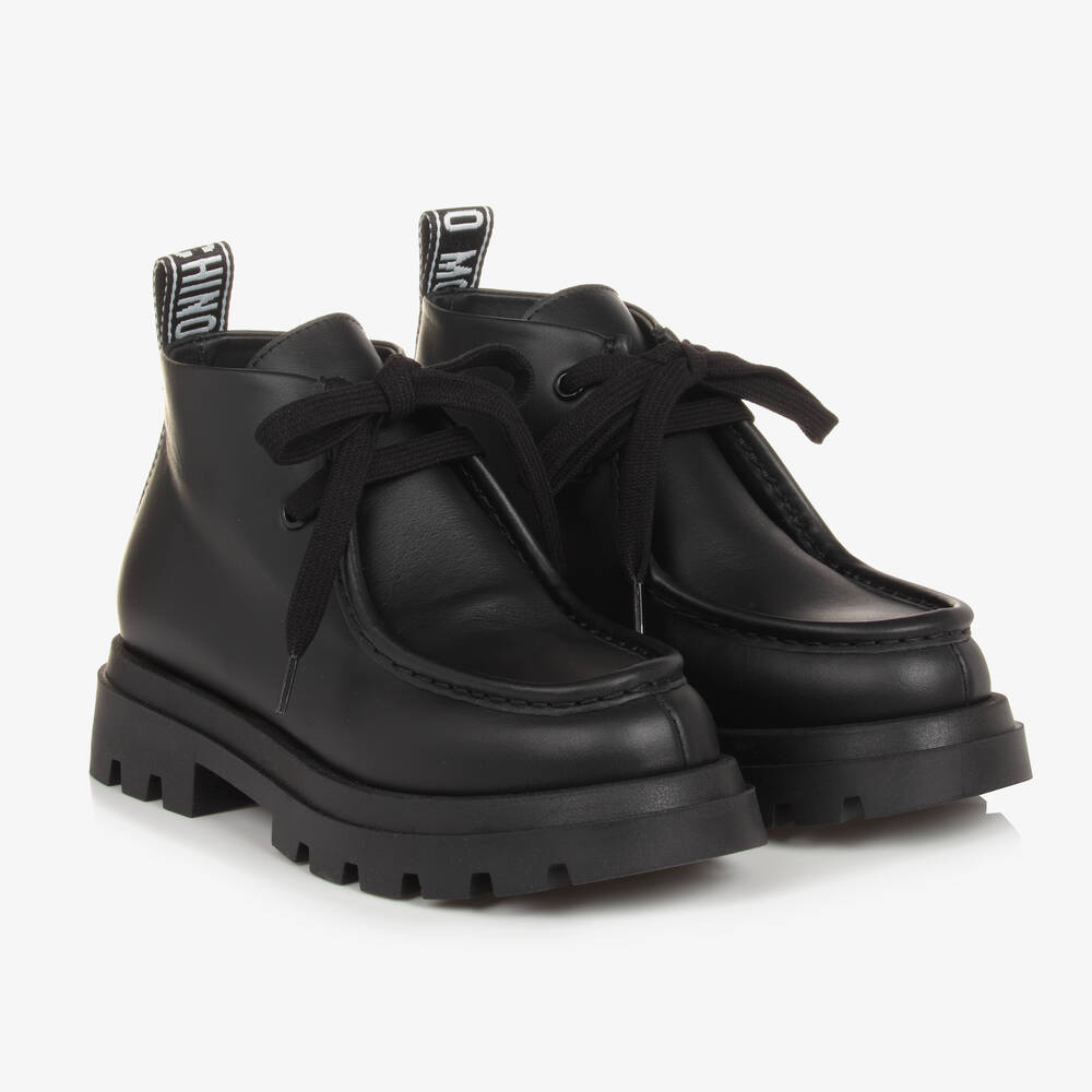 Black leather boots for boys by Italian fashion house Moschino, featuring a moccasin toe design. Lined in smooth leather for comfort, they fasten with laces and have a chunky non-slip rubber sole for good grip. They are trimmed with logo tape on the back of the heel for instant brand recognition.