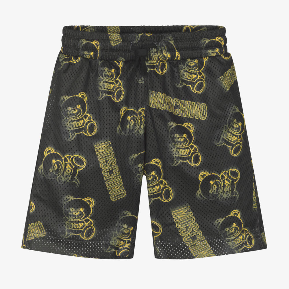 Casual black shorts for boys by Moschino Kid-Teen, made in soft and breathable mesh. The brand's signature Teddy Bear logo is printed with an all-over yellow graffiti-effect, for an edgy streetwear look. They have a stretchy drawstring waist, with useful pockets at the sides and are fully lined for comfort.