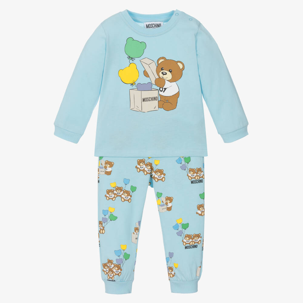 Sweet blue cotton trouser set for little boys by Italian designer Moschino Baby, patterned with the brand's signature Teddy Bear and colourful balloons. The set is made in comfortable jersey with cosy ribbed trims, and the top has useful popper fastenings on one shoulder to make dressing easy.