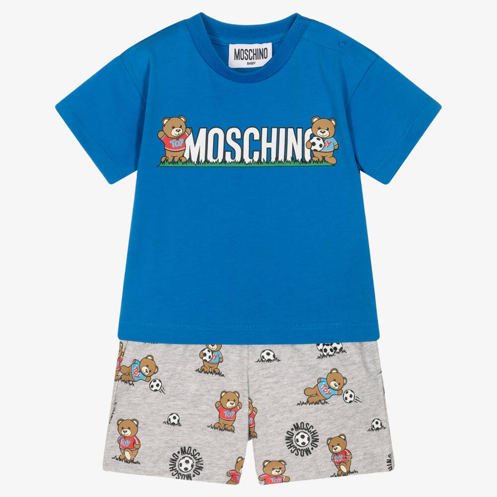 A blue and grey shorts set for little boys, by luxury fashion house Moschino Baby. Easy-to-wear, the cotton jersey T-shirt has shoulder popper fastenings, while the shorts have a stretchy waistband and comfy pockets. For an instantly recognisable look, both items feature the brand's iconic Teddy Bear logo, having fun playing football.
