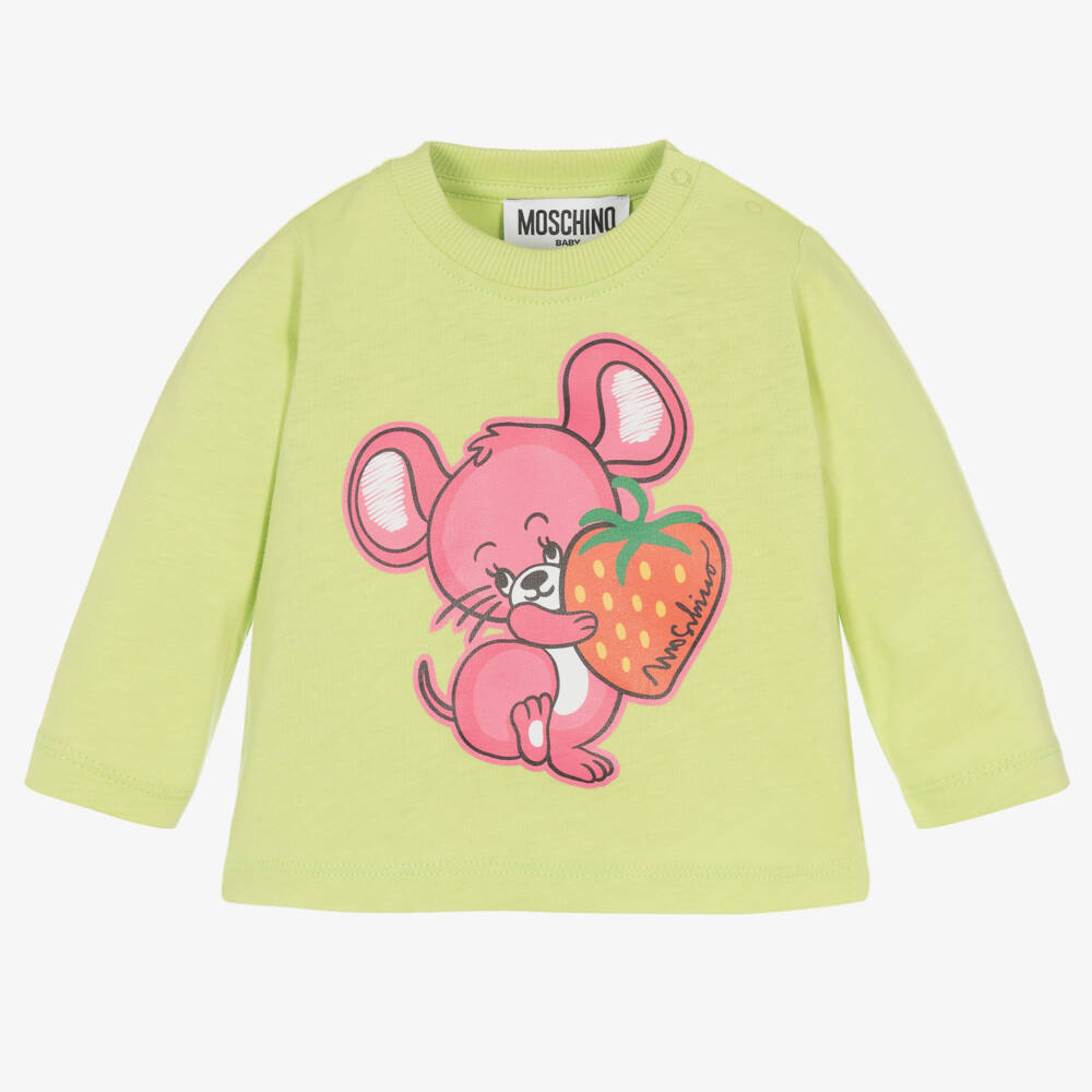 Lime green Mini-me top for little boys by Moschino Baby, made in soft organic cotton jersey. Fastening easily with shoulder poppers, it has an adorable dark pink Baby Mouse and strawberry logo print on the front.