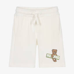 Ivory shorts for boys by Moschino, made in soft, comfortable cotton piqué. Cool and casual, they have useful side seam pockets and a drawstring elasticated waist for an adjustable fit. The iconic Moshino Teddy Bear logo is printed on one side for a fun designer finish.